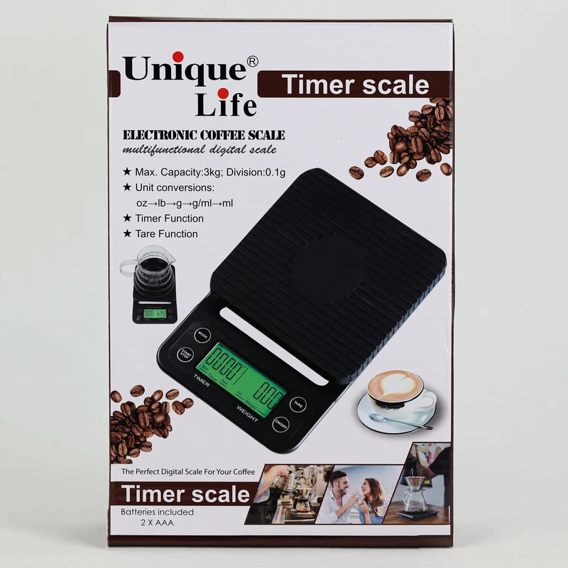 با ترازوی الکترونیکی قهوه Unique Life به سطح حرفهای میبرد و تضمین میکند که هر فنجان قهوه شما بینقص باشد. چه شما یک باریستا با تجربه باشید و چه علاقهمند دمآوری در منزل، ترازوهای چندمنظوره Unique Life طراحی شدهاند تا دقت دمآوری شما را به سطحی بالاتر برسانند.تقسیمبندی ظریف: اندازهگیریهای دقیق کلیدی برای رسیدن به کمال نوشیدنی واحدهای چندگانه: تغییر آسان بین اونس، پوند، گرم و میلیلیتر برای سازگاری کامل با هر دستورتارا (Tare): محاسبه وزن خالص قهوه بدون وزن ظرف با فشردن تنها یک دکمه نمایشگر LCD بزرگ و خوانا: کار با ترازو را ساده و بدون دردسر میکندطراحی مدرن و جمعوجور: زیبایی و کارایی همنشین در هر آشپزخانه دوام و قابلیت اعتماد: ساخته شده از مواد باکیفیت برای طول عمر و عملکرد پایدارقابل حمل و سبک: کارکرد با دو باتری AAA با بستهبندی شامل باتریها، آماده استفاده از همان روز اول مناسب برای استفاده شخصی و حرفهای: گزینهای ایدهآل برای هر دوستدار قهوه
